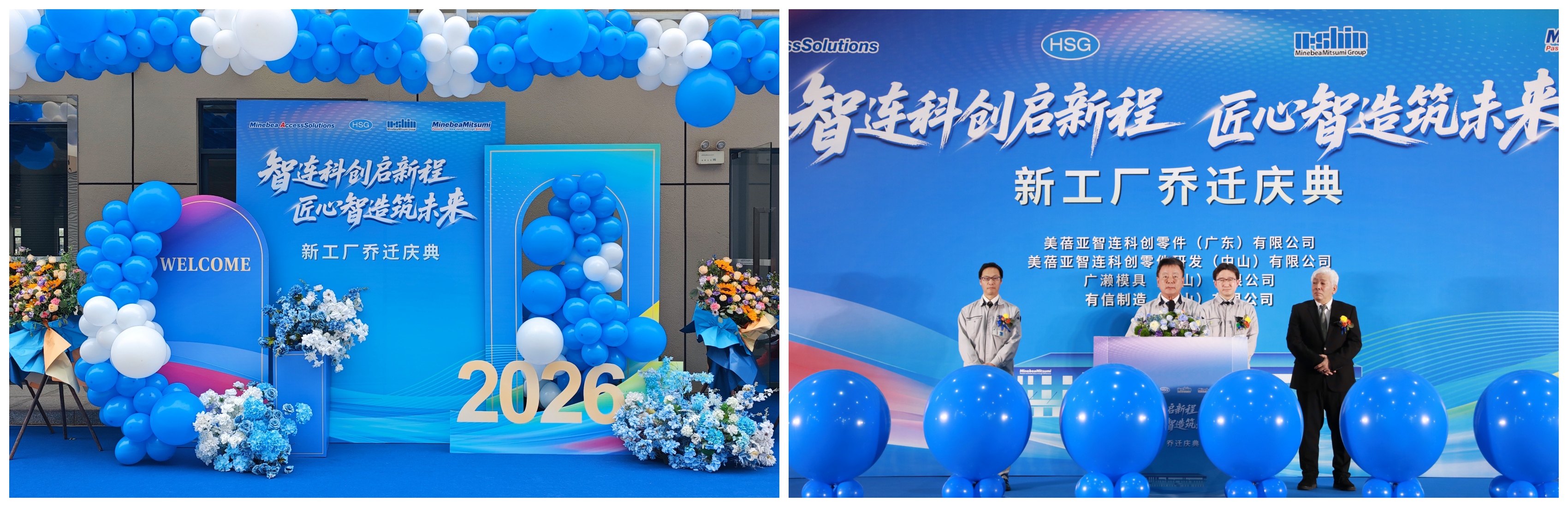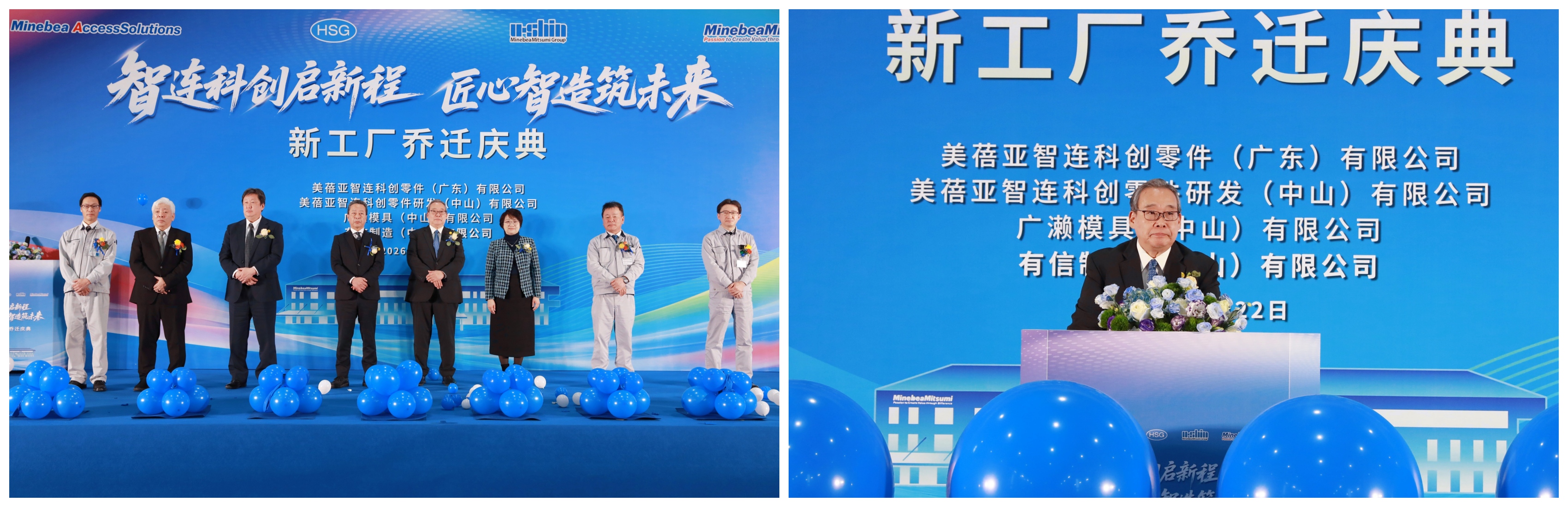 2026年1月22日,美蓓亚智连科创零件 (广东) 有限公司、美蓓亚智连科创零件研发(中山)有限公司、广濑模具(中山)有限公司、有信制造(中山)有限公司 四社乔迁庆典仪式在公司体育馆隆重举行。美蓓亚三美株式会社 岩屋副社长、AS事业本部 中村本部长、石上中国总支配人;美蓓亚智连科创零件(广东)有限公司 齐藤董事长,小榄镇工业总公司总经理、美蓓亚智连科创零件(广东)有限公司副董事长麦锦华女士,总经理助理胡嘉辉先生等嘉宾应邀出席,连同四社全体同仁共同见证这一重要时刻。